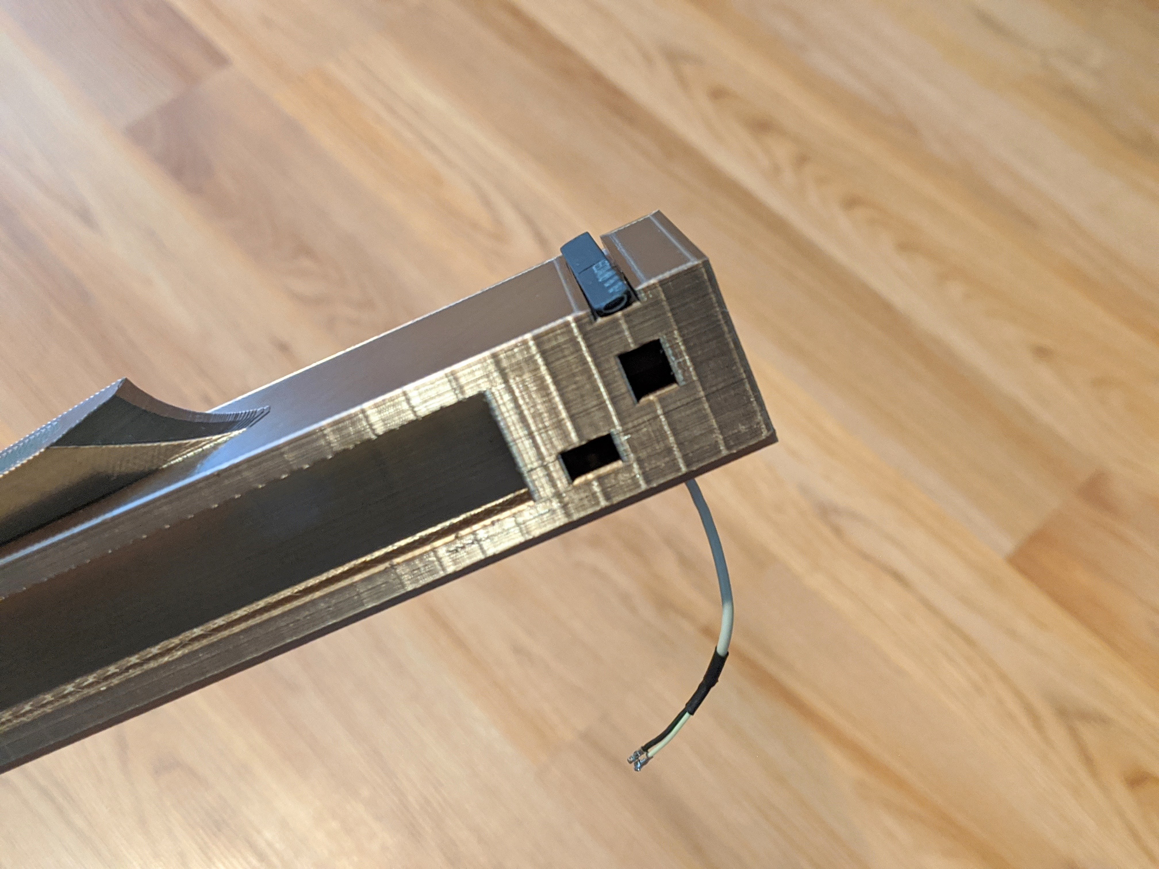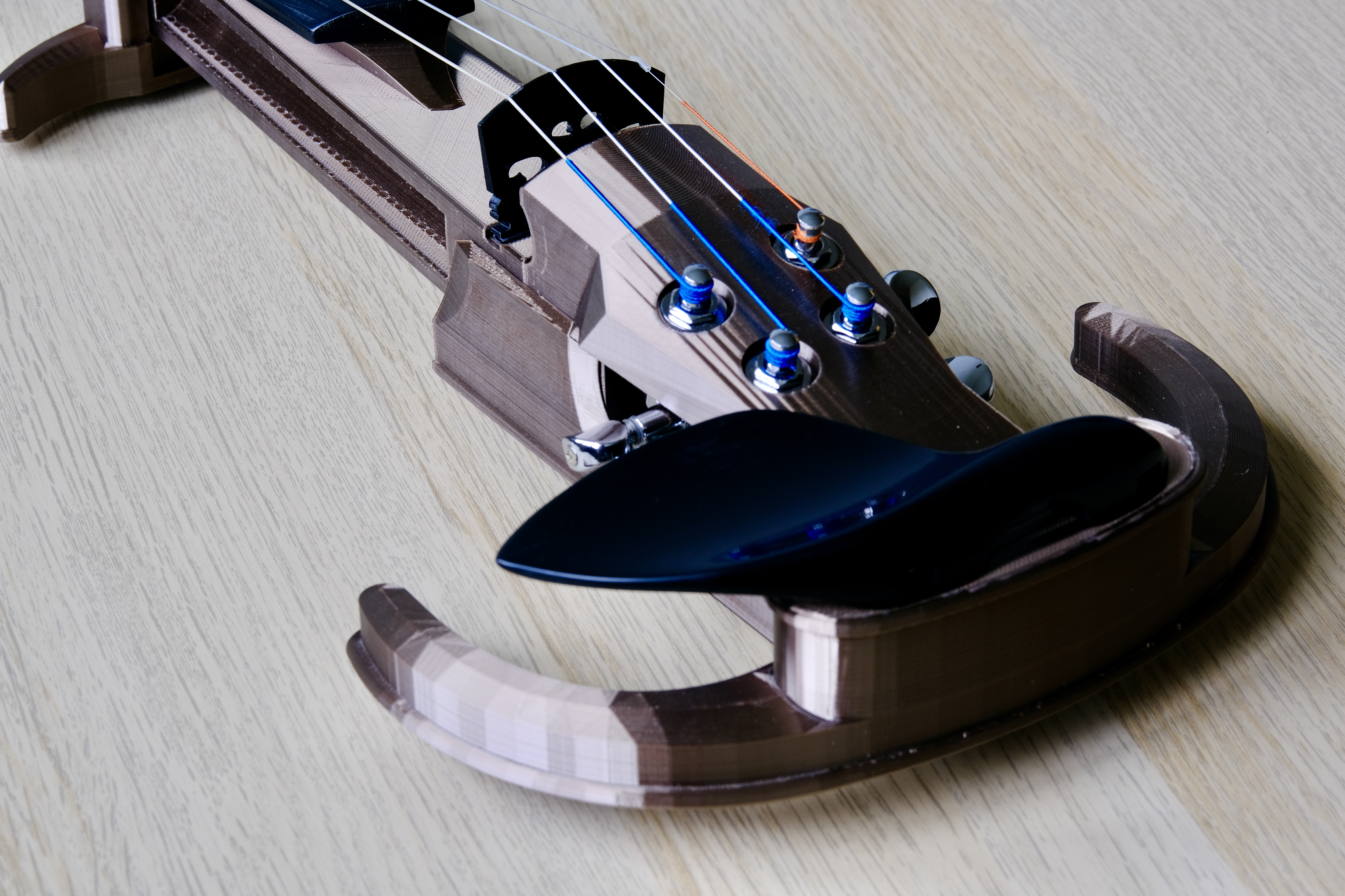 This is a fully functioning electric violin I built with 3D-printed body parts, violin strings, guitar tuning pegs, amplifier electronics, screws and nuts, and a carbon fiber center rod. Design is from the JAx electric violin by Jaxelsson, with some personal modifications.